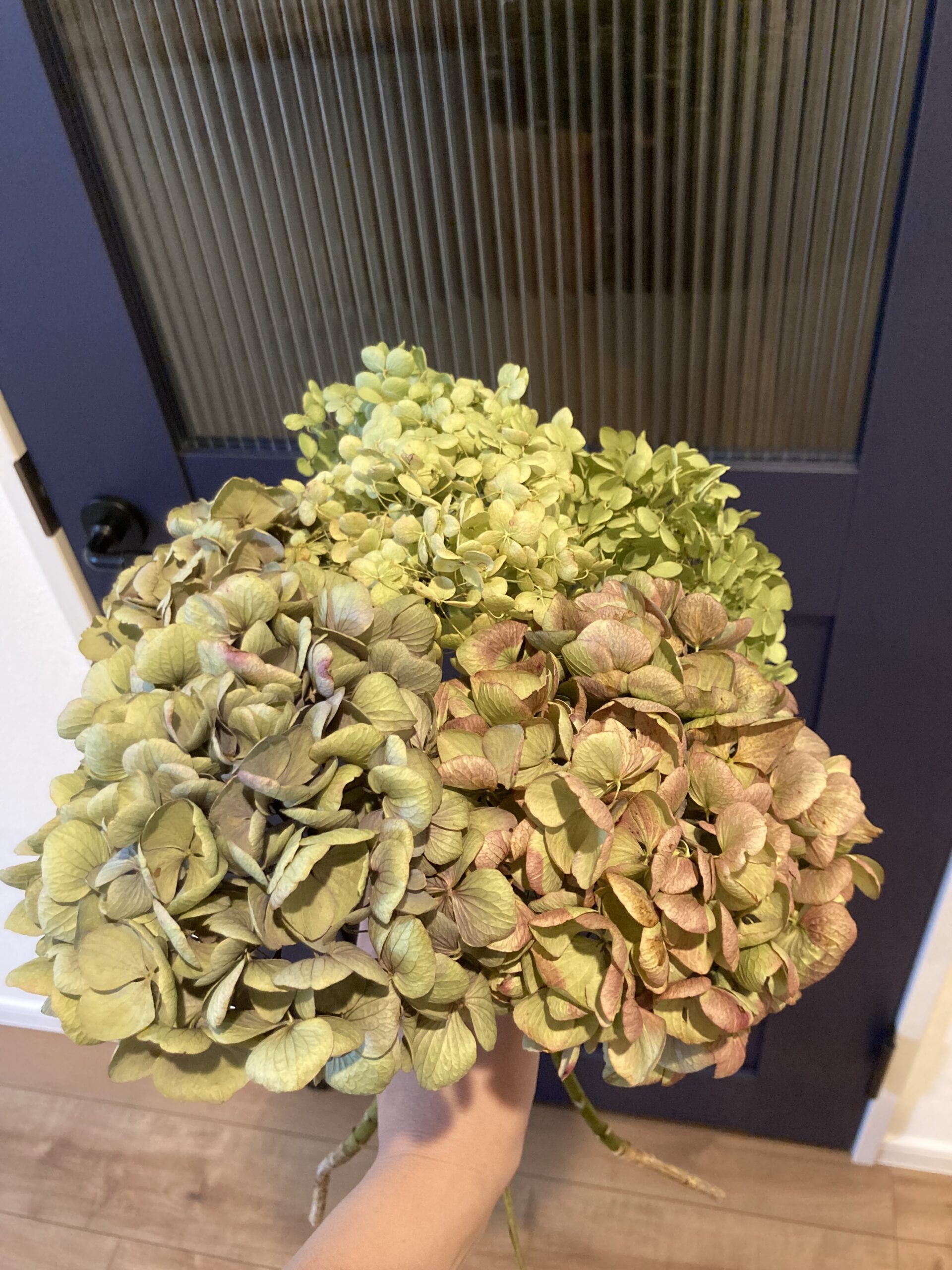 パンパスグラスと一緒にアナベルという種類の紫陽花・アンティークカラーが可愛い秋色紫陽花を購入しました。