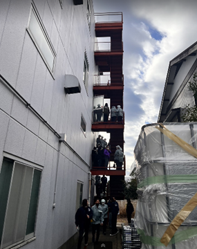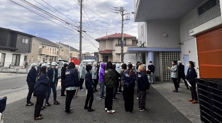 防火管理責任者講習を受け令和5年1月19日に避難訓練を行いました。 講習で使用されているビデオを流し火災が起きた場合、どのように行動をしたらいいか流れの確認をしました。 画像:従業員全員でビデオ講習中 実際に火事が起きたと想定して、 【火災発見係】【通報役】【消防署員役】の役割に分かれシュミレーション その際に、消火器の使い方・消火器がどこに設置されているか場所の確認をしました。 最後に避難誘導訓練を行いました。 緊急時、実際に使用する非常階段を使い外に避難・点呼を取り訓練終了。 画像:非常階段を使用し避難中 画像:避難が終わり点呼確認中 頭の中で分かっていても1度シュミレーションをしないと分からなかった部分がありました。 湘南工場では、非常階段の扉のロックが錆びており固くなっていました。 その後、女性1人の力でも開閉できるようにメンテナンスしました。 場内放送にて火災発生を知らせたところ作業場によって音量が小さかったり聞こえない事も分かりましたので、 スピーカーの再確認を行い、万一に備えてメガホンを設置しました。 今後も避難訓練を年間スケジュールに入れ行っていきたいと思います。