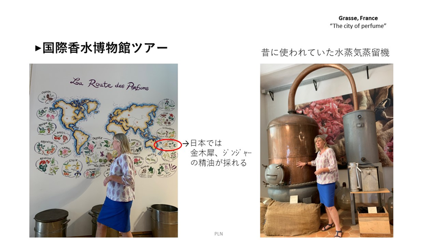 Business Trip Report Oct 2019 Kanako.S ◆期間:2019/10/3~10/4 ◆目的地:フランス グラース ◆目的:精油の特性を学ぶ フランス南東部に位置する「香水の街」で、地中性気候で温暖な土地。 無形文化遺産として2018年11月に登録されており、 芳香植物栽培技術や調香技術が選ばれたそう。 まずは、国際香水博物館ツアーに参加! 国際香水博物館は、フランス文化省が認定するミュゼ ドゥ フランス(Musée de France)として 保証された1,218館の美術館・博物館のうちの一つ。 その後は、現地に住むYukoさんと、Café des Museesにてランチ。 内装も素敵で、メニューの種類も豊富。 トマトジュースにペッパーを振って飲むのが主流だそう! 現地で採れた新鮮な野菜を使った料理がとても美味しかった。 この後は、香料会社のPayan社に訪問し、 現場、調香室、エバリュエーター室を見学させて頂き、 精油の特性や、抽出について詳しく学んだ。 **続き「フランス ニース、カンヌ編」**