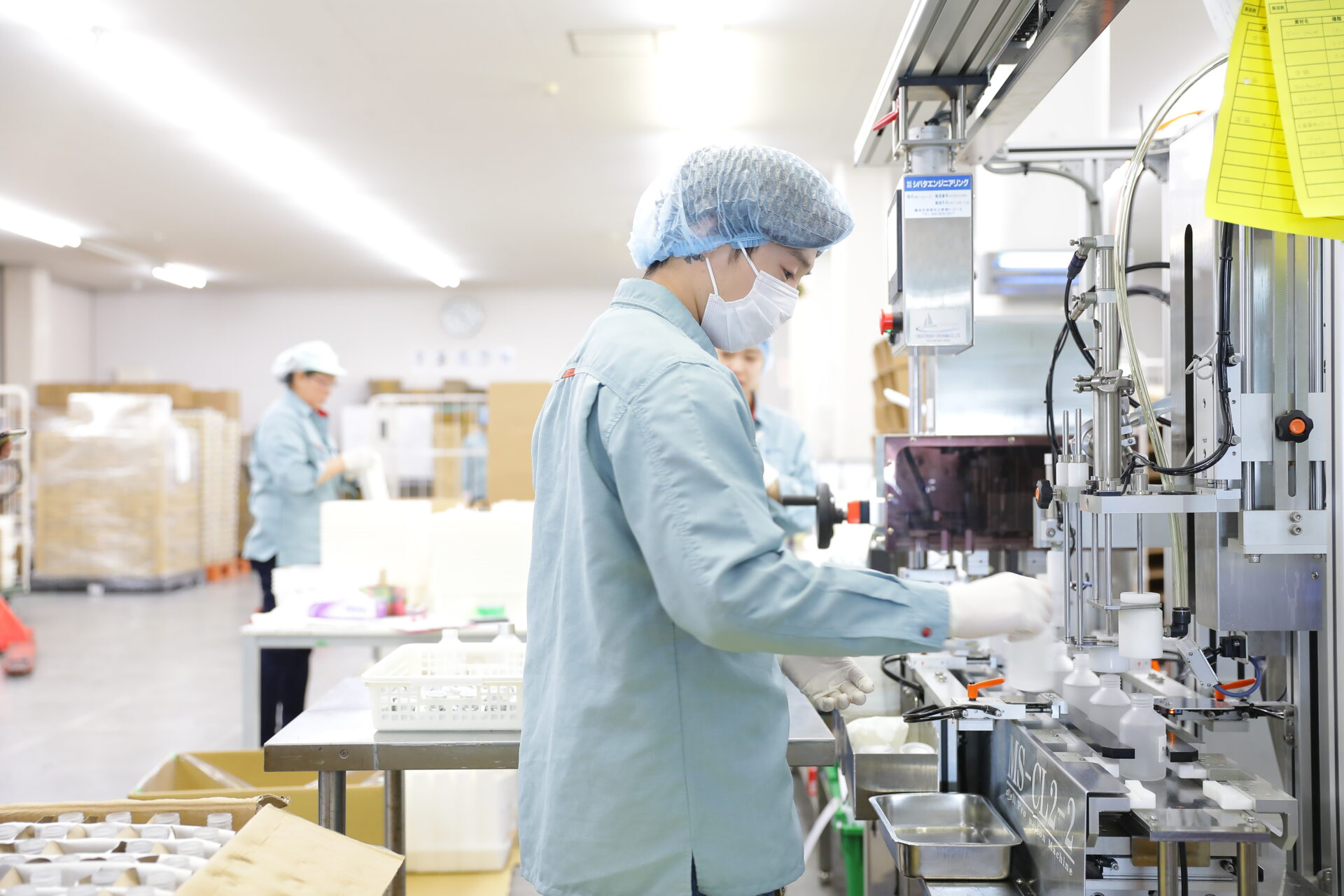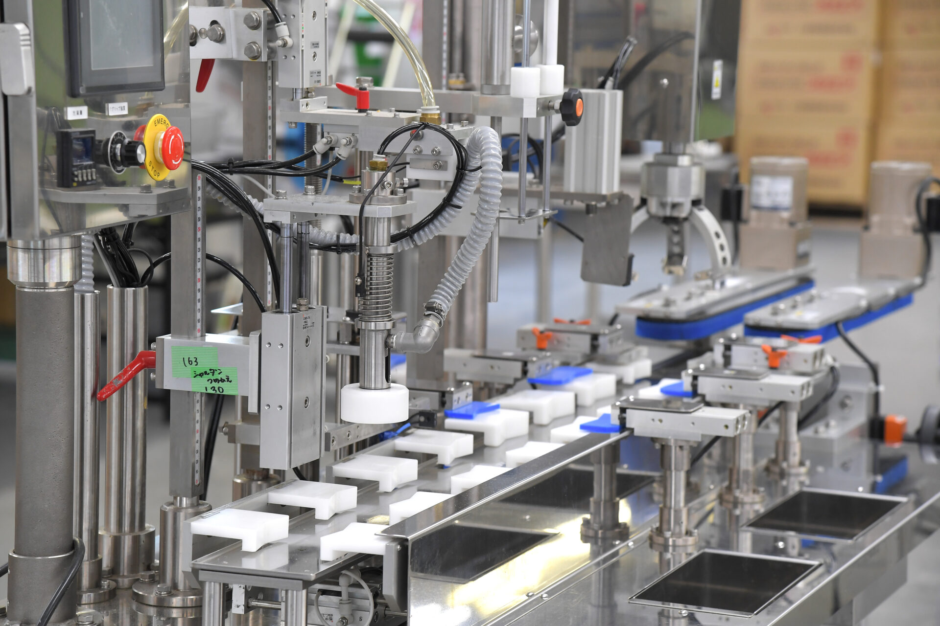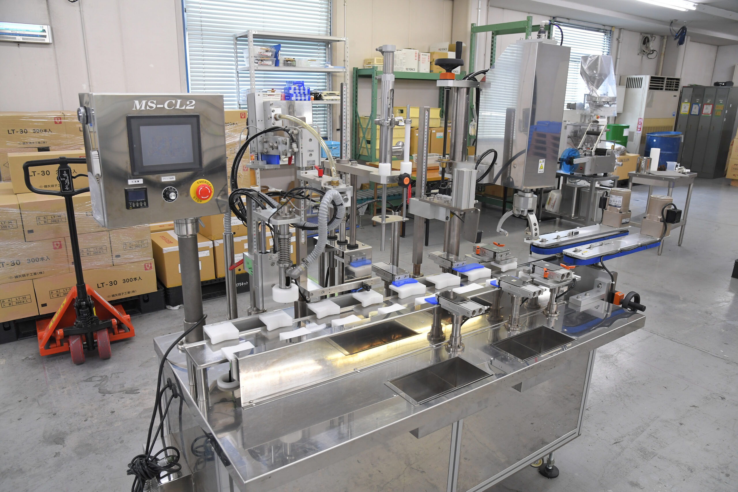 柔軟な生産が可能 1台でエアー洗浄・充填・中栓装着・キャッピング・底面ロット印字・ラベリングまで対応(一貫生産可能) 短期間で製造ラインの変更が可能(多品目の製造に最適) 手作業と自動化のハイブリッド方式(柔軟な生産が可能) 省スペース設計で、拡張性が高い(後工程の追加が容易) 品質管理しやすいセル方式(作業者ごとの管理が容易)